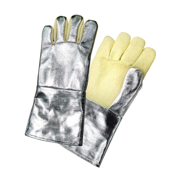 Găng tay kết hợp sợi dệt aramid và sợi thủy tinh mang lại độ bền cao và khả năng chịu nhiệt độ lớn. Với một mặt phủ nhôm giúp phản xạ bức xạ nhiệt, tăng cường khả năng bảo vệ.